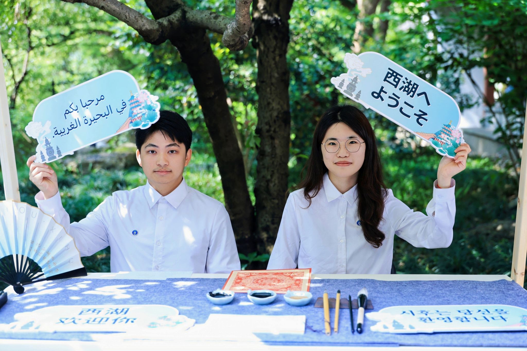 At the Hangzhou International Sister Cities Pavilion, members of the multilingual guiding team engaged in practical activities through forms such as multilingual flash mobs of West Lake poetry, on-site guiding, and cultural experiences, interpreting the stories of the West Lake cultural heritage and Hangzhou's international exchange achievements in multiple languages to boost the city’s internationalization.