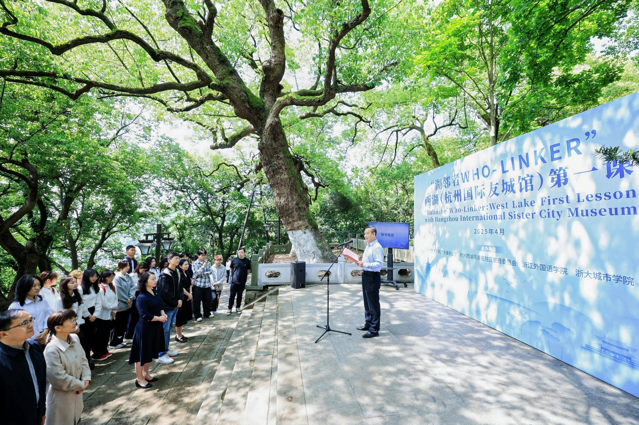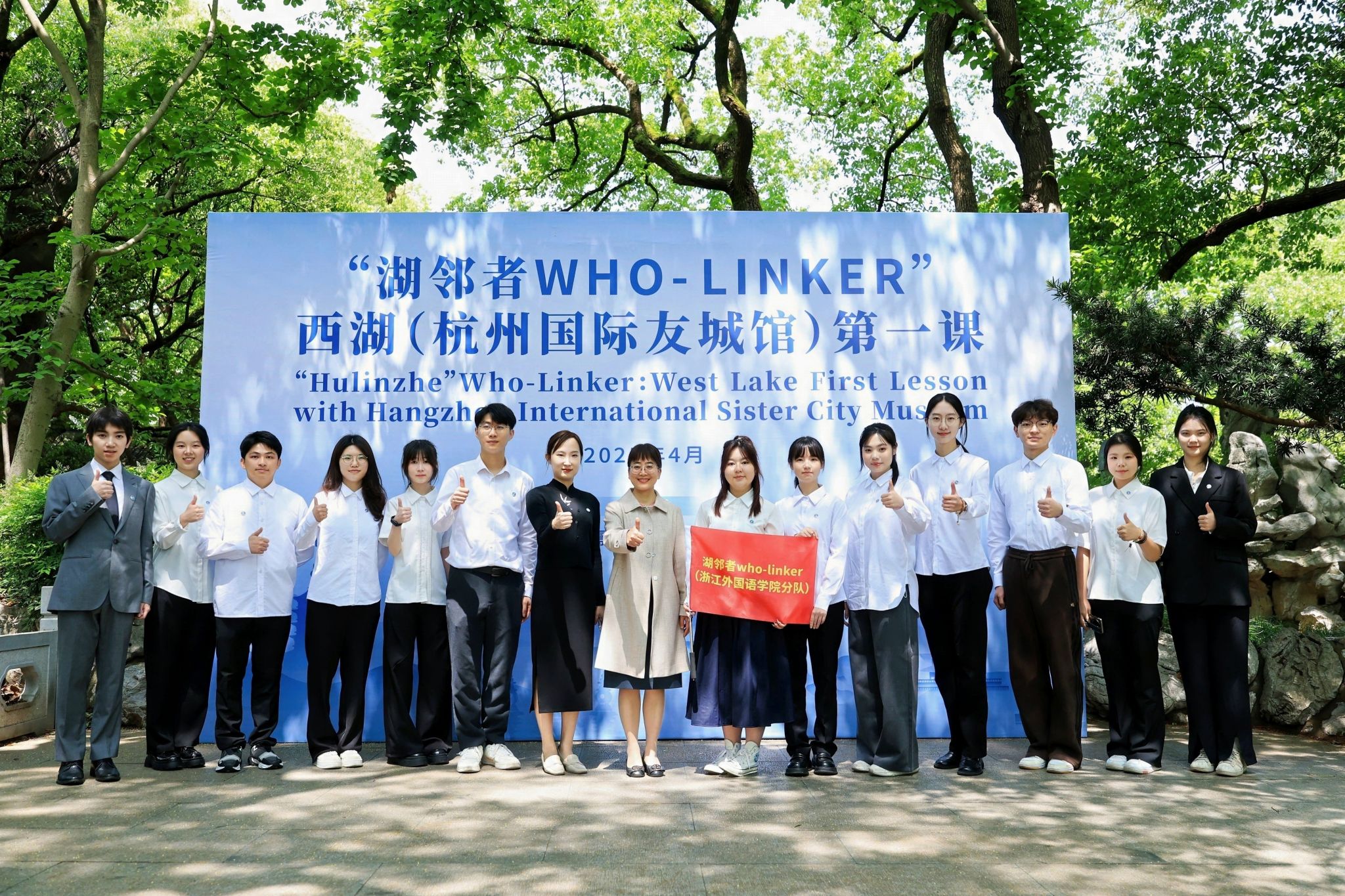 The first session of the "WHO-LINKER Lake Neighbors” program was officially launched on April 25 at the Hangzhou International Sister Cities Pavilion in the West Lake Scenic Area. The event was co-organized by the Foreign Affairs Office of Hangzhou Municipal People's Government, the Administrative Committee of Hangzhou West Lake Scenic Area, Zhejiang International Studies University (ZISU), and Hangzhou City University (HCU). Leaders from ZISU's College of Asian Languages and Cultures, members of the "WHO-LINKER Lake Neighbors" multilingual guiding team, and other attendees participated in the event.