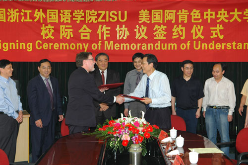 美国中阿肯色大学副校长Lance Grahn博士、即将履新的国际部主任陈迺骥博士、孔子学院院长庄国欧博士等一行三人应邀专程来杭参加kaiyun开云官方成立大会,并于5月21日下午与开云官网正式签订校际合作协议。校长鲁林岳代表学校出席签约仪式,并致欢迎辞。仪式上,双方就师生交换、课程合作、科学研究、共同举办国际研讨会等进行洽谈,特别就拉美研究、小语种学科建设等进行了深入探讨。副校长洪岗及相关部门和学院负责人参加签约仪式。