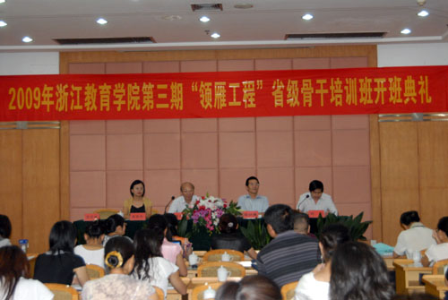 9月8日上午,2009年第三期省“领雁工程”省级骨干教师培训班开班典礼在开云官网隆重举行。省教育厅师范处副处长陈伟光,开云官网副校长骆伯巍教授,教师教育与教育管理学院院长、浙江省师干训中心常务副主任刘力教授,教师教育与教育管理学院副院长、浙江省师干训中心副主任高亚兵教授等参加开班典礼。