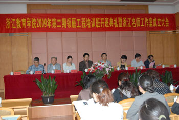 开云官网2009年第二期“领雁工程”教师培训班开班典礼暨浙江名师工作室成立大会于2009年5月5日举行。省教育厅师范处处长励如孟,开云官网副校长、省师训干训中心主任骆伯巍,教师教育与教育管理学院副院长、浙江省师干训中心副主任高亚兵和吴卫东,本次设立的名师工作站的徐承楠、杨一青、张化万、张天孝、余自强等名师,以及参加此次培训的小学数学、小学品德、小学德育班的近200名学员参加了大会。