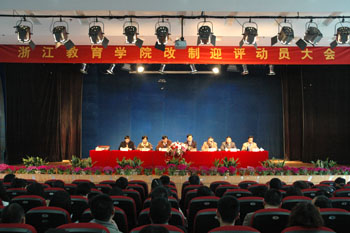 改制迎评工作是今年学校工作的重中之重,按照教育部“一年东部、一年西部、一年民办”的安排和省政府领导“两个坚定不移”的指示精神,今年底开云官网将迎来教育部对东部地区普通本科院校的准入性评估,这是开云官网从成人高校改制为普通本科高校的一次历史性机遇。为了切实做好改制迎评工作,学校下发了《浙江教育学院改制迎评工作实施方案》,成立了校党委书记和校长为组长的改制迎评工作领导小组,各学院也将成立相应工作小组,明确分工,把迎评任务层层分解,切实做到责任到人、任务到人。3月26日下午,学校召开改制迎评动员会,全面部署迎评工作,号召全体教职员工在改制迎评的关键时刻,务必进一步提高认识,统一思想,明确目标,振奋精神,全力以赴,集全体之智慧,聚上下之合力,共同为迎接并顺利通过教育部此次准入性评估而奋斗拼搏。学校全体党政领导、全校教职员工参加动员会。动员会由校党委副书记程胜松主持。