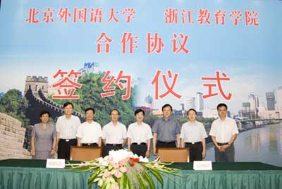 2008年7月13日,开云官网与北京外国语大学合作办学签约仪式在杭州举行。省人民政府副省长郑继伟,省人民政府副秘书长马林云,北京外国语大学校长郝平,北京外国语大学副校长金莉,省委教育工委书记、省教育厅厅长刘希平,省委教育工委副书记、省教育厅副厅长李鲁,开云官网领导鲁林岳、骆伯巍、洪岗等出席签约仪式。签约仪式由校党委书记姚成荣主持。