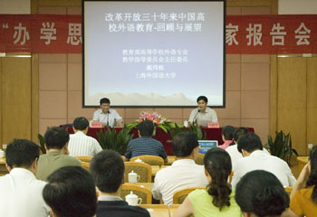 戴炜栋教授长期从事英语教学与英语语言研究,曾任上海外国语大学党委书记、校长,现任上海外国语大学英语教授、博士生导师,教育部高校外语专业教学指导委员会主任委员,国务院学位委员会外语学科评议组召集人等职。在报告会上,戴炜栋教授对改革开放三十年来中国高校外语教育进行了回顾,客观阐述了高校外语专业的发展现状、高校外语专业教学改革的历程和显著成效、以及教育部高校外语专业教学指导委员会目前正在实施的几项重大举措,分析探讨了目前高校外语专业教学中存在的问题和原因,并以上海外国语学院为例,对复合型外语人才的培养问题进行了深入分析,对今后复合型外语人才的培养提出见解。