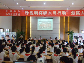 2008年9月20日,由浙江省语言文字工作办公室主办、《小学生世界》报承办的“‘珍视明杯’啄木鸟行动”颁奖大会在义乌市福田小学隆重举行。荣获本次活动组织奖的10名学校代表、30余名获奖同学代表以及福田小学的200多名师生参加了颁奖大会。省语言文字工作委员会办公室负责人朱丹、省普通话测试中心主任姚剑光、义乌市教育局副局长葛晓明、教学月刊社社长董景尧等领导出席了此次大会。