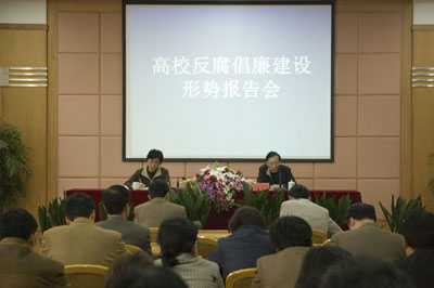 赵关君同志首先通报了2007年以来发生在我省教育系统(高校)部分案件的情况。然后,他在分析特点、剖析原因时指出,这些案件具有发案部位比较集中、窝案串案多、违法违纪金额大、涉案人员层次高、违法违纪性质明显、作案时间与高校基建高峰期重合等特点;此类案件高发的原因是:高校处在大发展时期、制度流于形式、管理松懈、部分单位对反腐倡廉不够重视、部分人员素质不高等。最后,赵关君对高校加强党风廉政建设提出要求:一是学校党委要加强领导班子建设,领导干部要严格执行上级的有关规定和要求;二是学校要加强对权力的监督,领导干部要自觉接受组织监督;三是要加强制度建设,抓好制度的执行,用制度来管人、管事。