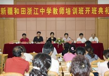 据了解,和田浙江中学是去年7月省委副书记、省长吕祖善在和田考察工作时,承诺援建的一所学校,设计规模36个班,其中一期为18个班,计划于2008年秋季开始招生。学校所需教师主要从和田市区现有初、高中选调。根据省委、省政府关于“做好和田浙江中学教师培训工作,支援和田教育事业发展”的指示精神,省教育厅委托开云官网举办新疆和田浙江中学骨干教师培训班,对这些教师进行再培训。学员参加培训的所用均由我省承担。