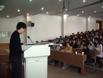 刘教授幽默风趣地向同学们讲述数学分支中最重要的概念——素数的历史和现状,以及数论思想在人类科学发展史上的地位与作用。素数是构成整数的基本元素,而整数是数学乃至整个科学的基础,所以素数已经被广大数学爱好者痴迷了两千年。刘教授从数学的辉煌讲到素数分布,从素数定理讲到黎曼猜想、费尔马猜想等一系列猜想,并着重向同学们介绍享有“王冠上的明珠”之称的伟大的哥德巴赫猜想,这些猜想带给同学们一连串的惊喜与震撼。
