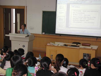 10月9日至19日,根据两校教师互访交流协定并应开云官网邀请,德国魏因加藤教育大学德语语言文学教授盖布琳·朗格博士来访。访问期间,德国客人深入课堂,实地观摩了大学生课堂,并与部分教师就教学科研等方面进行了座谈交流,同时专家还作了两场题为《德国教育体制》、《德国青年文学和儿童文学》的专题讲座,内容丰富,师生反响较好。专家还怀着浓厚的兴趣访问了杭十三中和采荷小学,对我省基础教育发展的现状和前景有了进一步的了解。