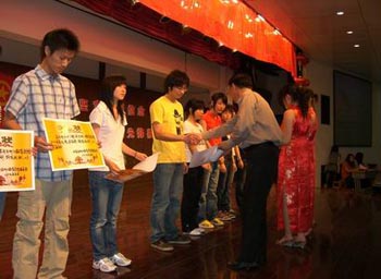 首先上场的是来自建工052的蔡叶菲、陈娟等同学,他们穿着礼服、正装,表明了认真参赛的态度,并以娴熟的朗诵和默契的配合打响了精彩的第一枪。最富激情的是来自市场053的男生组合龚强强和任委同学,他们带来的《满江红》充满了英雄气概和豪迈,博得了全场掌声。最具舞美效果的是来自会计052的蔡文珠等同学带来的《五月的日历》,以小品表演的视觉冲击力呈现了日本强占青岛,国人拒签合约的真实事件,引起了在场观众的共鸣。来自法律053的参赛选手是整晚阵容最强大的,两位男生主角的背后有16位女生配合着加以吟诵,气势宏伟,充分显示了团结的力量。男生中最出采的要数市场051的皇浦宇驰朗诵的《以共产党员的名义》,不仅声音掌控得很好,感情也把持得恰到好处,细节上也处理得游刃有余,当之无愧地获得了比赛的第一名。法律053的姜柏爱等同学分别获得了二、三等奖。晚会还就四月份开展的团支部建设月活动进行了总结,并颁发了2006年度优秀团员、优秀团干部、优秀团支部和最佳团日活动的奖项。