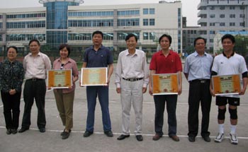 经过近20多天的紧张角逐,由校工会主办、体育学院协办的校第四届教职工软式排球比赛于6月6日圆满结束。艺术学院代表队、湘湖校区代表队分别蝉联冠亚军,后勤公司代表队、理工学院代表队分获第三名、第四名。本次活动得到各学院、部门、直属单位工会的全力支持。校党委副书记、体委主任程胜松等多次亲临赛场,为大家鼓劲。7日下午,由本届比赛冠军队与其他各代表队队员组成的联队举行了精彩的表演赛。赛后进行了本届比赛颁奖仪式。校领导鲁林岳院长、程胜松、何钧观摩了表演赛并为荣获前四名的代表队颁了奖。鲁林岳院长在讲话中对本届软排比赛给予了充分的肯定,并鼓励教职工积极参加体育运动,增强体质,为学校发展、家庭幸福多做贡献。