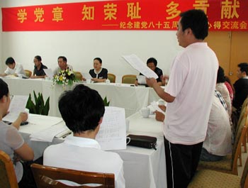 交流会上,与会同志还学唱了《八荣八耻歌》,激扬的歌声充分显示了同志们学党章知荣耻的态度,衬托了本次交流会的主题。