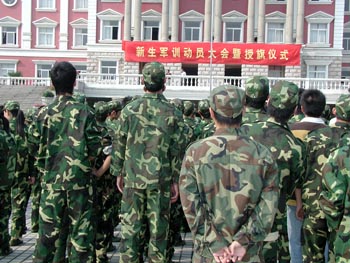 在程胜松副书记向军训团团长方振军授军训团旗后,学生们即刻投入到了紧张艰苦的军事训练中。