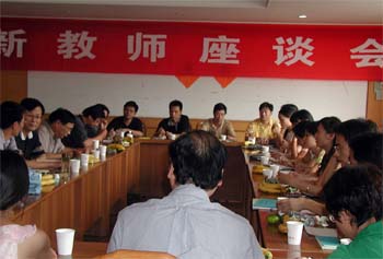 老教师们也纷纷发言,把自己的从教经验无私地与新教师们分享。王学杰教授回忆自己当初进校时,也曾参加过学校组织的新教师座谈会。无论是旧日环境、物质的简陋还是今日的丰盛,都无不显现着教院一贯的优良传统:以人为本;显现对年轻教师成长的人文关怀。作为教学上颇有成就的老教师,王教授给了教师职业道路上刚刚起跑的新教师们几点经验之谈:要学会宽容做人,要为人师表,要钻研教学方法,争取在一两年的时间把讲台站稳。两位年青的“老教师”,邵恩民老师和董华英虽分别只两年和一年的教龄,但已对教师这一职业有了较多的体会和感慨。邵老师从新教师如何更好的完成从学生到教师角色转变的角度,就爱岗爱生、虚心求教、勇于开拓、具备“三才”等方面谈了自己的切身体会。董老师结合自己所授课程谈了“如何使教学成为一件快乐的事情”的教学理念,提出了对教师角色的独到认识和理解。