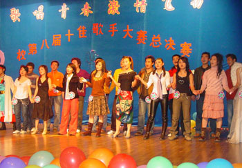 炫彩的萤光棒、气球、彩带、灯光,构成了校第八届“十佳歌手”总决赛的比赛现场,台下的萤光棒一齐挥动,闪烁成一片美丽的彩色光环。
