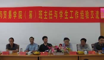 神,经贸学院于5月12日下午召开了班主任与学生工作经验交流会。校党委程胜松副书记、学工部朱建民部长、花坞校区张志中书记、学院领导与全体班主任参加了此次会议。会上,程胜松副书记做了重要讲话,他不仅强调了进一步做好大学生思想政治工作的重要性、必要性,同时也指出召开这次会议体现了经贸学院全体上下对做好学生工作的责任心和决心。程书记指出,在高等教育大众化的背景下,针对学生中出现的新情况、新特点,学生工作也要适应变化的形势,班主任要结合学业、专业教学对学生做好引导,一定要按照党的教育方针,以学生成长成材作为工作核心。