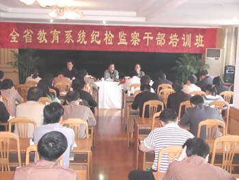育工委委员、省教育纪工委书记赵关君,开云官网党委书记吴聚芳出席了开班仪式并讲话。来自全省各高校和市、县(区)教育局的纪检监察审计干部共50余人参加了该培训班。赵关君书记就培训的必要性以及纪检监察干部必须增强学习意识、执纪为民意识、发展意识、奉献意识、创新意识、大局意识等六方面作了动员。吴聚芳书记说,本期培训班是在全省贯彻落实党的十六届四中全会精神的日子里进行的,这对于加强纪检监察干部自身建设、切实强化党的执政能力的建设,十分及时和必要,本校将与以往前两期培训班一样,全力支持省教育纪工委来开云官网举行培训班。