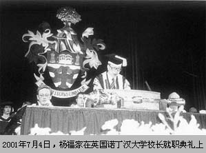 我有幸作为诺丁汉校长主持很多仪式,在我面前有一个权杖,凭王室给我的权杖来行使我的权力。我最感到自豪的是,凡是我坐到这个台上的时候,校园里就升起了五星红旗,在英国的大学里升起五星红旗是很罕见的,但是每次去我看到这面五星红旗我就感到一种自豪。有一次在台下坐了一个华侨会会长叫江凤翔,他一定要请我吃饭,他说自己是60多年前来到英国的,问我,你知不知道我来的时候英国人叫我什么,我说不知道,他说叫我“清人”,清朝最腐败了,叫我清人,不叫我华人,没有想到现在这里最有名的大学中间的惟一一套衣服、惟一的一顶金边帽给真正的华人戴上了。