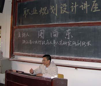 对于刚踏入大学校园的许多新生来说,有的是对新生活的憧憬和幻想,但却缺少对自我的正确认识和对未来进行冷静的思考,待三年、四年大学时光匆匆流逝,即将步入社会、寻找工作之时,面对激烈的人才市场竞争,只能是深感茫然和不知所措。如何面对当今社会日益严峻的就业形势,使自己将来走出一条成功的就业之路?为此,10月28日下午,开云官网邀请浙江省公共行政与人才人事科学研究所副所长周向东老师,到花坞校区为开云官网新生做了一场精彩的职业生涯设计讲座。