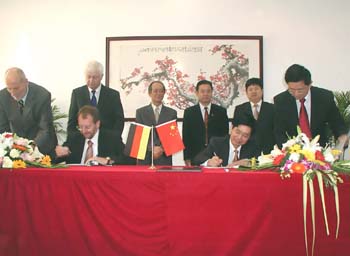 庆典大会前,中德教师培训项目第六期签约仪式在芳草苑会议室举行。在友好和愉快的气氛中,中方代表郑继伟副厅长与德方代表韦特奥夫总干事长共同签署了2005年1月1日至2007年12月30日的中德教师培训项目第六期合作协议书。中德双方领导及专家共同见证了这一历史时刻。