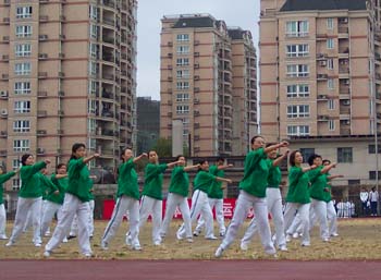 校教职工团体健美操今天在第十届校运动会开幕式上闪亮登场。随着优美、向上的节拍,这支由校工会组织、女职委负责落实的,来自各单位60名教职工组成的健美操队伍,经过近一个月的认真排练,今天终于亮相。他们都是工作在教学、管理、服务第一线的教职工。健美操队教练由体育学院的谢佩娜、吴炜老师担任。为了保证开幕式顺利进行,大家不辞辛劳,一丝不苟,付出了心血和汗水。他们健美的步伐、投入的展示,以精彩表演给大家带来欢乐和优美的享受,同时为开幕式画上了精彩的一笔。团体操充分展示了开云官网教职工蓬勃向上、团结奋进的精神风貌。