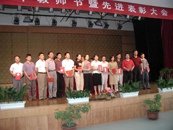 大会在庄严的国歌声中隆重开幕。党委副书记程胜松首先在会上宣读了2003年度获得全省优秀教师,全国优秀共青团干部,省第十一届哲学社会科学优秀成果奖,省高校优秀政治辅导员,省高校优秀科研成果奖,省高校“三育人”先进集体、先进个人,省优秀共青团干部,校“三育人”先进工作者,校 优秀教学奖,校工会先进集体、工会积极分子荣誉的集体和个人名单。在热烈的掌声中,校领导依次向获得上述荣誉的集体和个人颁了奖。校领导还向从教30年的教师李敏颁发了荣誉证书。