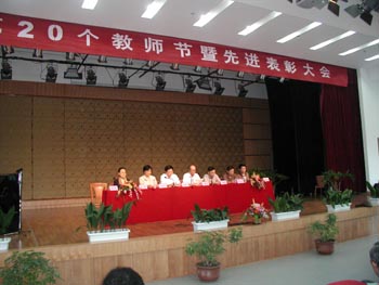 党委书记吴聚芳同志在会上作了重要讲话。他首先代表校党委、行政向全校教职员工和离退休同志致以节日的祝贺和亲切的问候,并向在大会上受到隆重表彰的省优秀教师王治文、全国优秀共青团干部吕君芳、省高校“三育人”先进沈扬等获得2003年度学校和省级以上奖项的先进集体和个人以及光荣从教30年的李敏老师表示崇高的敬意和最热烈的祝贺。他说,从1984年设立教师节以来的20年间,我们学校披荆斩棘,努力推进事业发展,实现了旧貌换新颜。如今,我们沿着实施改制和新校区建设,把学校建设成为一所有影响、有特色、综合性的教育大学的宏伟目标一步一个脚印地迈进,并取得了一个又一个阶段性的成果。吴书记强调,要实现学校建设发展的宏伟目标,一定要统一思想认识,坚定必胜信心,形成无坚不摧的力量;要以科学的发展观为指导,找准学校的定位,明确学校的办学理念和发展战略,走规模扩张与内涵发展同时进行又互相促进的路子;要坚持以人为本,坚持立足本职,兢兢业业做好三育人的工作,尽最大努力把学生培养成国家的栋梁之才;还要坚持并发扬依法治校、民主治校、求真务实、艰苦奋斗、追求卓越、争创一流、自强不息、奋发图强的精神,去克服前进路上的一个又一个难以想象的困难,创造出一个又一个令人瞩目的成绩。吴书记满怀豪情地指出,我们这一代浙教院人,是改制和新校区建设的参与者和见证人,我们将亲身经历学校带有根本性的巨大变化,亲自实现学校第三次党员大会制定的学校建设发展的宏伟蓝图,创造历史,创造学校新的辉煌!吴聚芳最后号召大家在邓小平理论和三个代表重要思想指引下,团结一心、群策群力、艰苦奋斗、发奋图强,努力把学校办成人民满意的学校,共同创造浙江教育学院美好的明天。