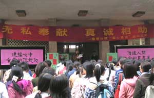 为了向关心和支持我们这个“爱心基金”的老师、同学表示诚挚的感谢,我们“爱心基金”的启动仪式在学生党员、学生入党积极分子《爱的奉献》的歌声中开始,随后院党委副书记程胜松老师对我们这个“爱心基金”提出了一些评价和希望并带头向“爱心基金”捐款。毕业生党员99生物班徐丹凤说到:“几百元并不是个大数字,但这代表了我们的浓浓心意,希望为每一位认真学习,真正有困难的同学解决后顾之忧。”