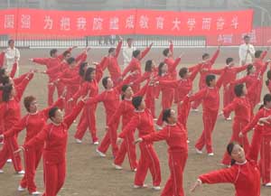 在雄壮的国歌伴随五星红旗冉冉升起后。王建华院长代表学院党委行政致开幕词,祝贺本届运动会的召开,并预祝本届运动会取得圆满成功。接着吴聚芳书记庄严宣布浙江教育学院第九届田径运动会胜利开幕。在正式比赛开始前,院教职工代表队身着统一的鲜红色运动服表演了力量与柔美完美结合的华尔滋舞。