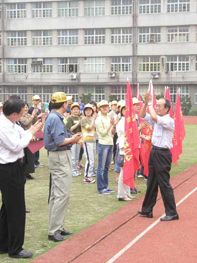 活动由院工会委员、青工委主任蒋福良主持。他介绍了此次活动的宗旨:在于进一步动员广大教职工和学生参加经常性的体育健身活动,以健康的身体预防疾病、投入学院的各项事业;同时,各位志愿参加者还将在这天通过清理校园环境的实际行动,度过有意义的节日。院党委副书记程胜松为该活动致辞。他说,在全国人民万众一心、众志成城抗击突如其来的"非典"的时候,院工会和团委举行该次活动具有重要的现实意义。他希望全院师生能够增强体育锻炼的意识,并以健康的心态更好的抗击"非典",共同为学院的稳定、发展出力。