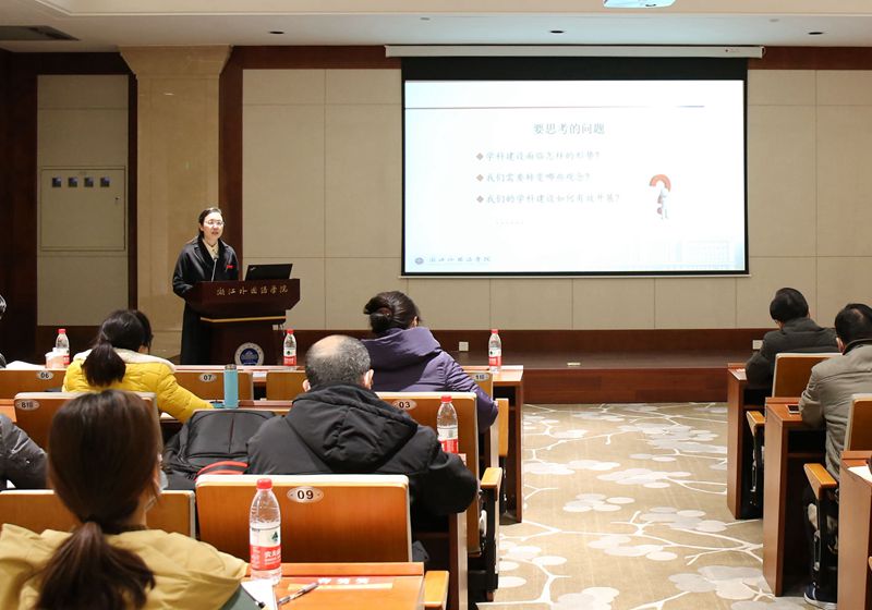 张环宙首先从学校改制转型、一流学科建设、硕士学位点建设的纵向发展历程、与全国外语类院校和省内高校横向比较以及浙江“重要窗口”的外部需求等三个不同的维度,剖析了学校学科建设的历史方位和外部需求,引导大家认清形势,寻找差距。随后,通过案例与数据分析,张环宙指出学校以往学科建设中存在的问题,强调在未来学科建设过程中,需要进一步转变观念,凝聚共识。要运用学科思维,重新审视学科建设对学校发展的重要作用;强化学科层次和体系,谋划建立合理的学科结构和布局;处理好学科发展中学科和队伍、学科和科研的关系,促进学科持续健康发展。她要求,学校未来学科建设要从注重顶层设计、编制学科规划,优化资源配置、培育特色学科,加强组织建设、提升学科水平三方面着手,以宣书记关于学科成熟期的八个特征为目标,对标争先,精准施策,真抓实干,并勉励大家以“功成不必在我”的境界和“功成必定有我”的担当,努力建设浙外小“窗口”出彩,为浙江大“窗口”添彩。