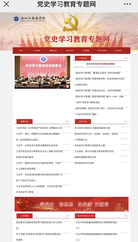 网站由党委宣传部设计制作,设有《习近平在浙江》学习、重要论述、党史评说、工作动态、工作部署、学习资料等栏目,带领浙外师生一起学党史、强信念、跟党走,营造良好学习氛围,推动党史学习教育走深走实。
