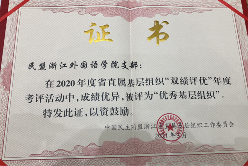 为表彰优秀、树立典型,民盟浙江省委决定,对在盟务工作中表现突出的优秀基层组织进行表彰。3月31日,经过推荐和评比,民盟kaiyun开云官方支部被盟省委授予“优秀基层组织”荣誉称号。