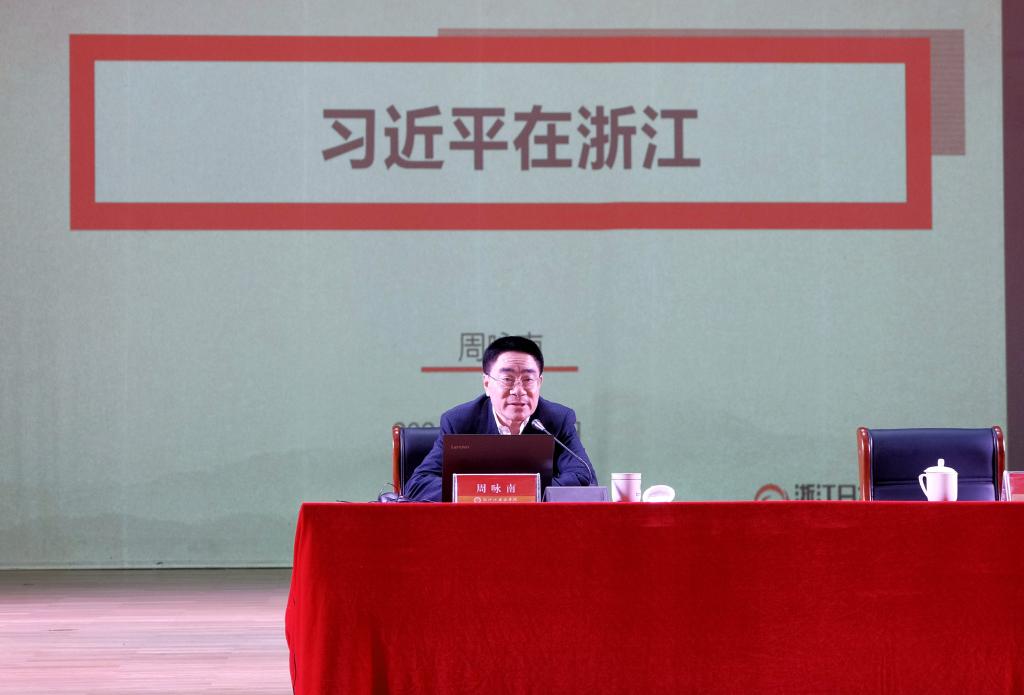 报告会邀请浙江日报报业集团原副总编辑、浙江省记协副主席周咏南作专题辅导报告。本次报告会既是一次专题学习会,又是一次校、院(处)两级理论学习中心组集中学习会,还是开云官网中层领导干部、党支部书记培训会。会上,作为习近平总书记在浙江工作期间的专职记者,周咏南结合亲身经历,围绕《习近平在浙江》采访实录,从总书记对教育的关心、对浙江的关心、在全党开展党史学习教育、数字化改革、八八战略、之江新语、从浙江到中央等8个方面,讲述了习近平总书记从浙江到中央工作后一脉相承的战略思想、辩证思维和以人民为中心的理念,以扎实的理论素养、广阔的理论视野和大量生动事例,充分证明浙江是习近平新时代中国特色社会主义思想的重要萌发地。