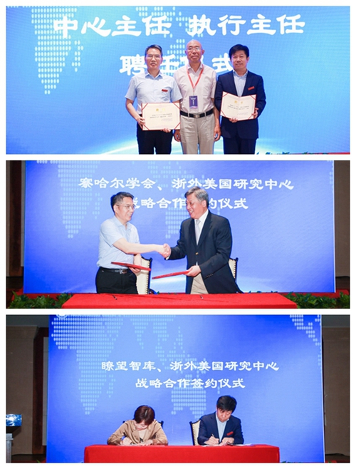 开幕式上,浙外美国研究中心与察哈尔学会和瞭望智库研究院达成战略合作框架协议,并现场签约。