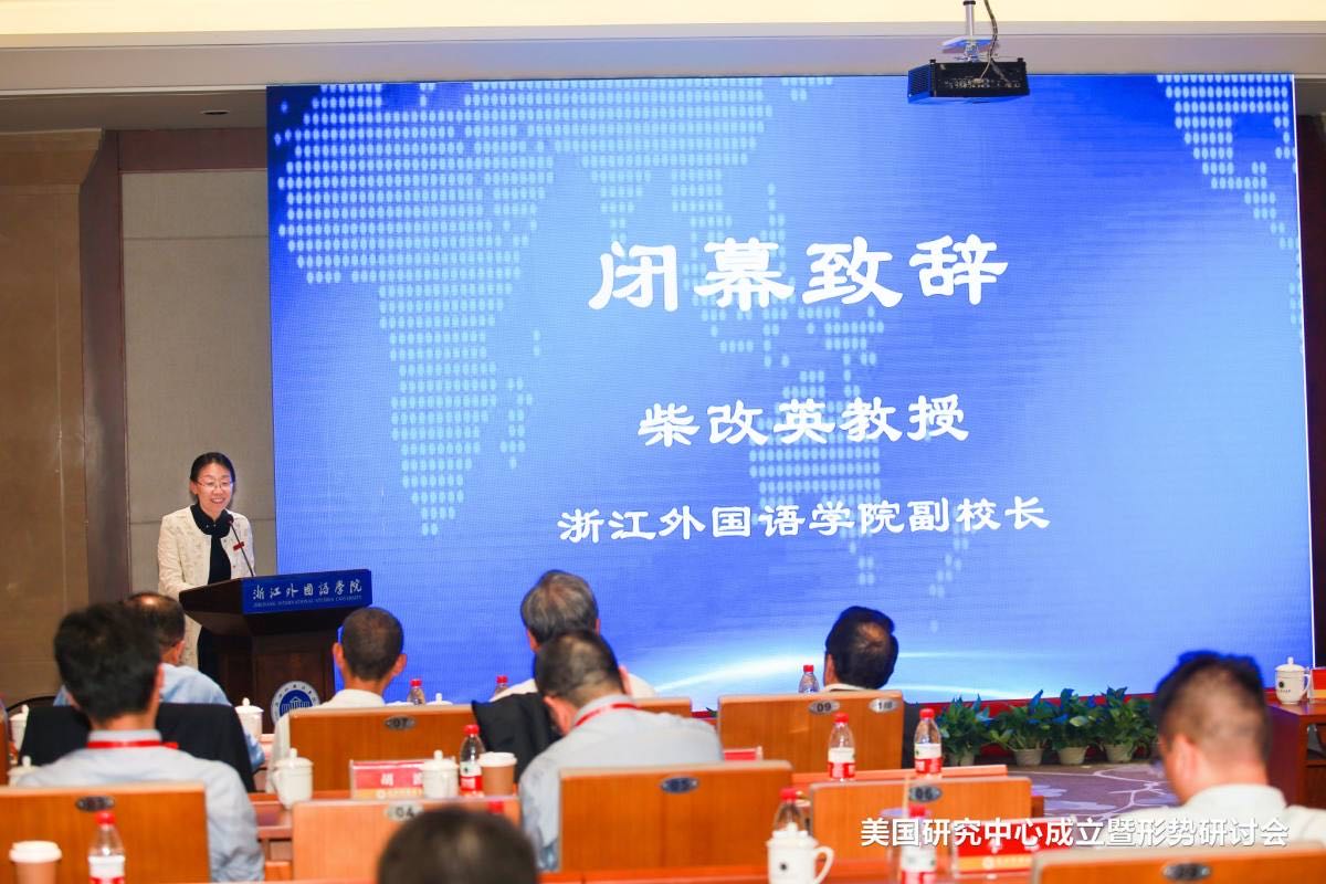 柴改英致闭幕词。她感谢各位领导和嘉宾对学校的关心、支持;感谢各位专家学者贡献的精彩纷呈的思想盛宴,让浙外师生对美国研究这一领域有了更直观的了解认识和更强烈的探究欲望;真诚地邀请各位领导和专家今后为美国研究中心的工作出谋划策,传经送宝;希望美国研究中心在大家的关心和帮助下茁壮成长,成为国内一流、具有国际影响力的高水平智库。