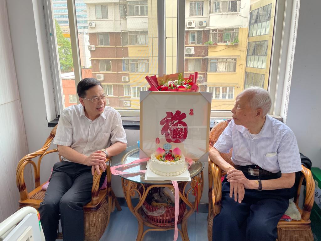 5月21日,党委副书记曹仁清看望慰问学校首位百岁老人金新老师,送上生日蛋糕、贺寿剪纸作品和鲜花,并代表学校向金老师致以亲切问候和生日祝福。