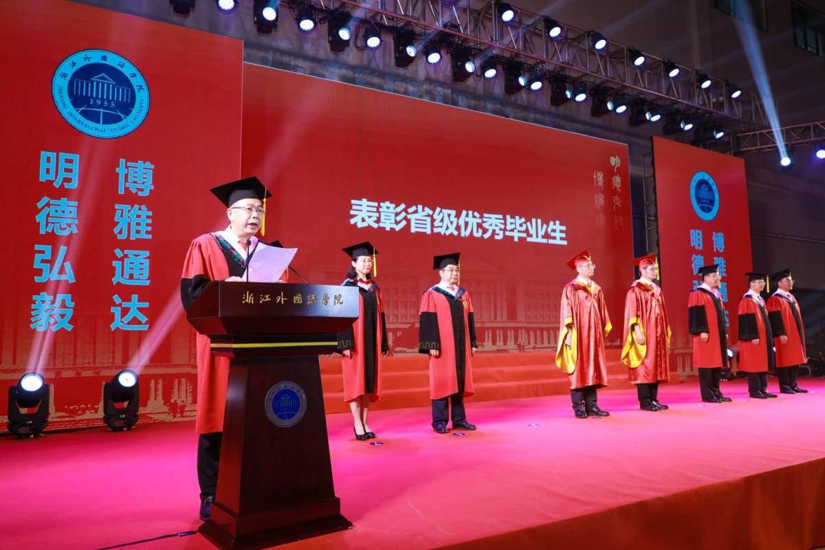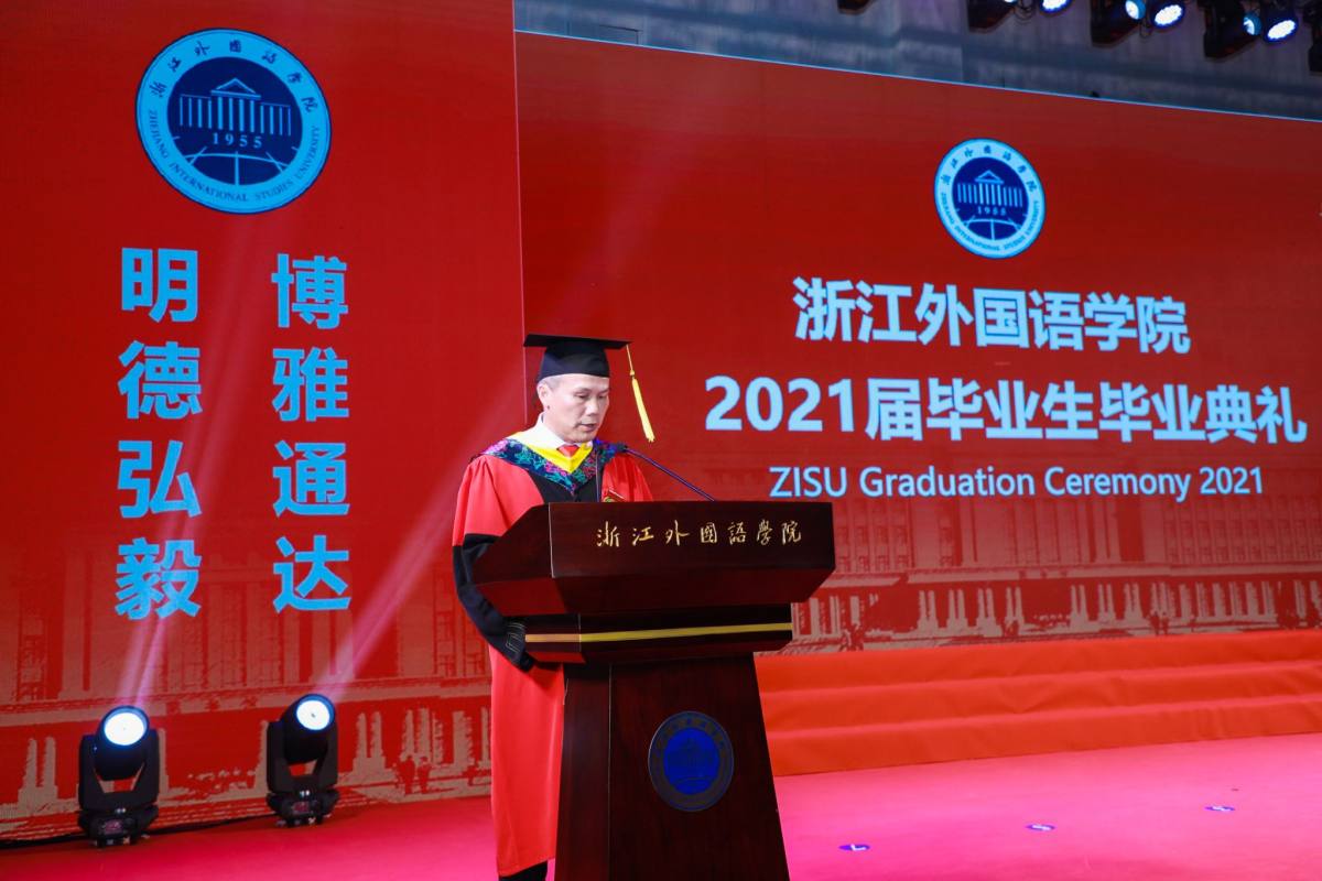 省十佳大学生入围候选人、校十佳大学生党员、2017级电子商务1班学生朱喆作为毕业生代表发言,分享了自己在浙外的成长、收获和对新征程的思考,立志身体力行践行“青春的责任与担当”。