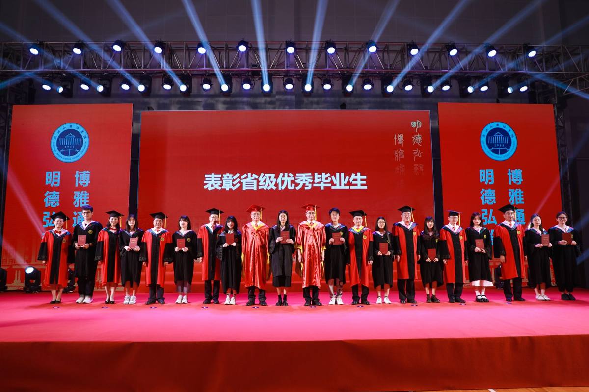 洪岗在毕业典礼上致辞。曹仁清宣读2021届省级优秀毕业生名单。赵文波担任主礼。校党政领导班子成员为省级优秀毕业生颁发荣誉证书。各学院和部门领导、教师代表、第八届我最喜爱的老师、辅导员、班主任等共同见证这一重要时刻。