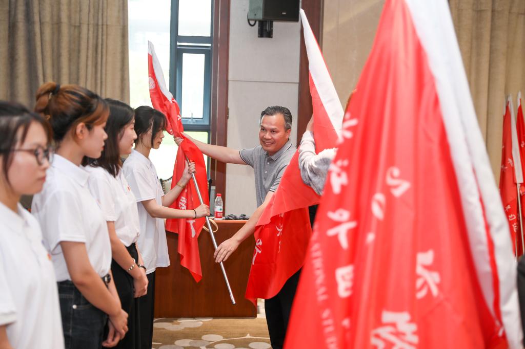 6月29日,浙外举行2021年“百年党史铸辉煌,青春奋进新时代”暑期社会实践暨“青年学子学青年习近平”学习教育专项实践出征仪式。校党委副书记赵文波作动员讲话并为暑期社会实践校级重点团队授旗。