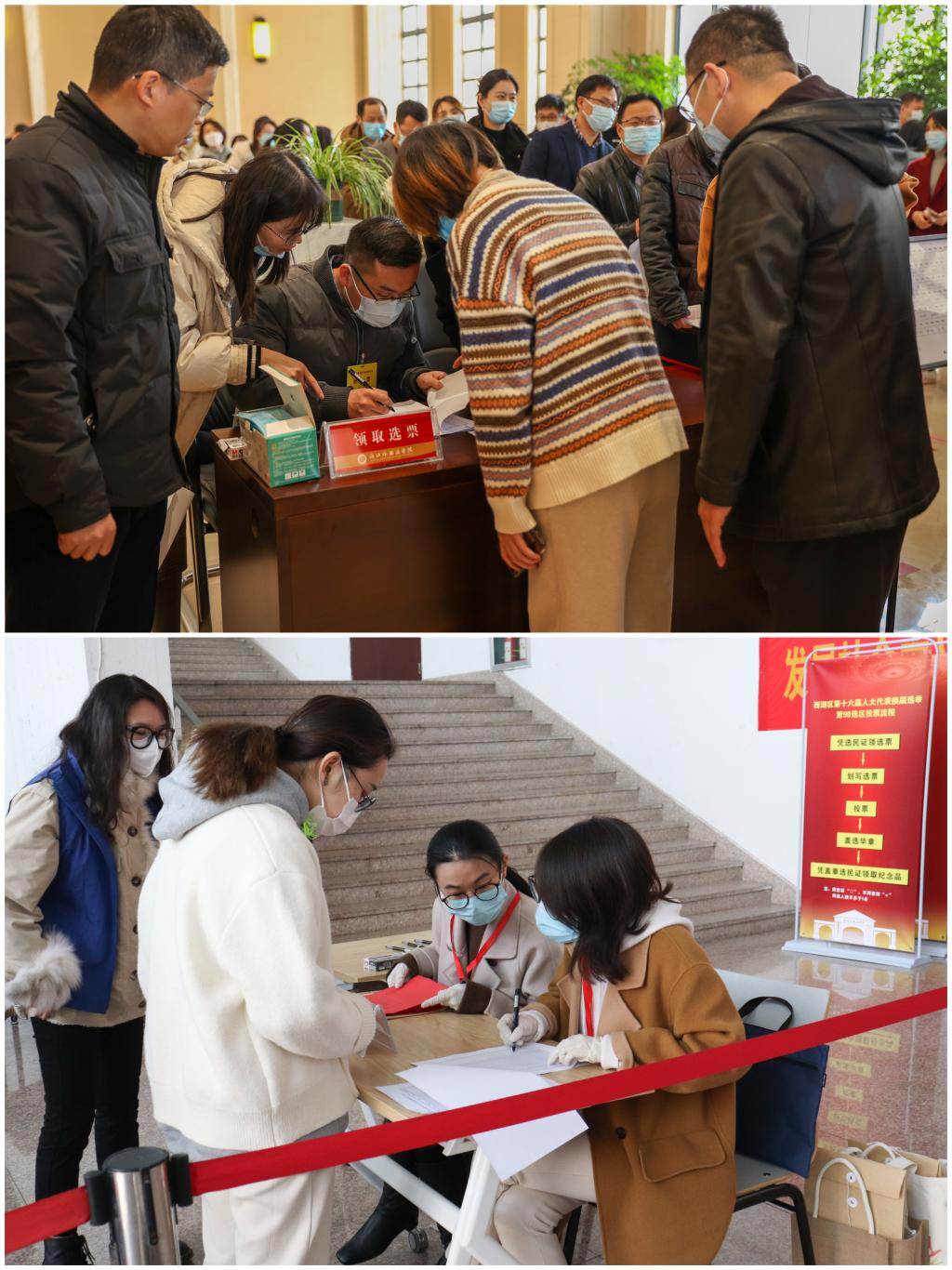 12时30分,投票启动仪式开始,主持人宣读了正式代表候选人名单以及投票点的负责人、监票、计票人员名单,介绍了投票选举的相关注意事项。随后,选民们依次将选民证递交给工作人员核验,领取选票,在写票处认真填写选票后走到投票箱前郑重投下自己的一票。