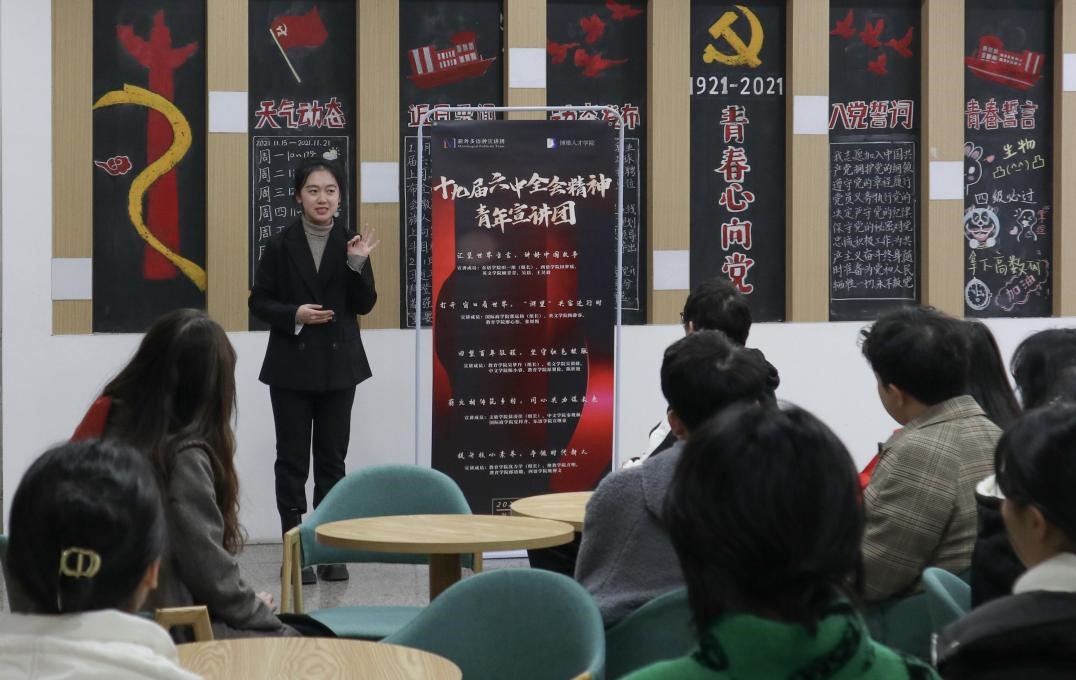 宣讲员,东语学院宋洋,教育学院李娟,文旅学院陈超,商学院、创业学院金丹,艺术学院万欣则结合学生工作,与学生党员、积极分子、团学骨干深入交流,把道理讲“浅”,把材料讲“薄”,用接地气的话语,讲述党的百年奋斗历程、新时代的辉煌成就特别是“两个确立”对新时代党和国家事业发展、对推进中华民族伟大复兴历史进程的决定性意义等内容。