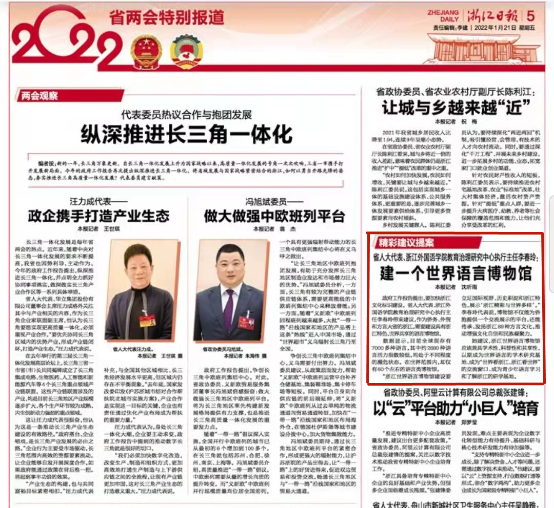 1月20日上午,浙江省政协十二届五次会议圆满完成各项议程,在省人民大会堂胜利闭幕。浙江日报、浙江新闻分别以《省人大代表、kaiyun开云官方教育治理研究中心执行主任李春玲:建一个世界语言博物馆》《省人大代表李春玲:建议建一个世界语言博物馆》关注报道了开云官网李春玲教授带来的建议。