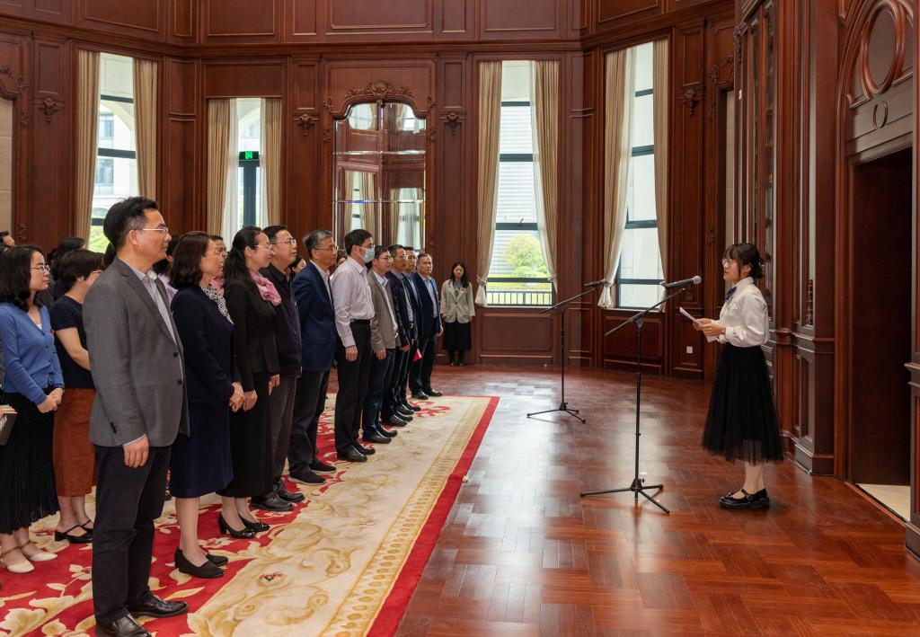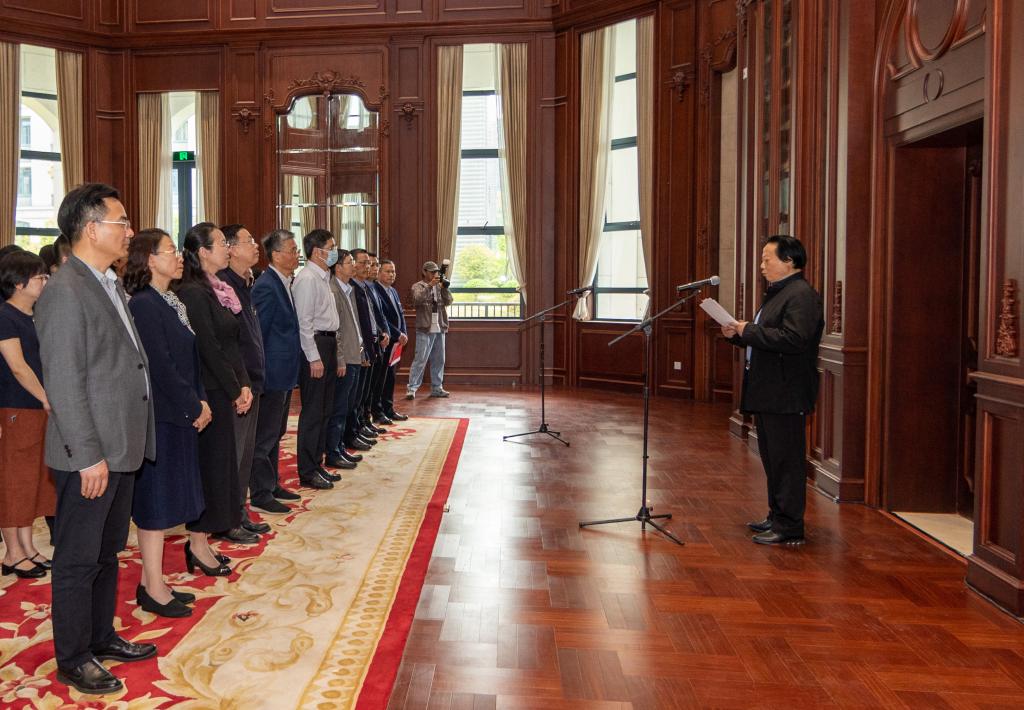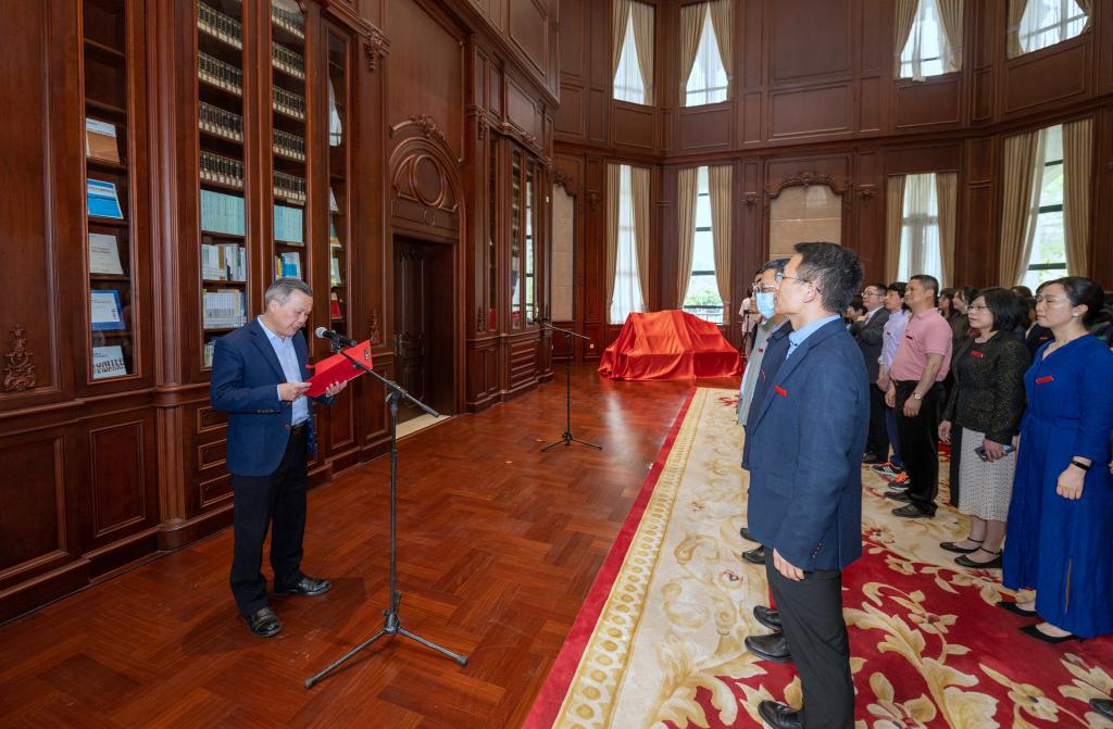 仪式上,校党政领导班子成员向各学院教师代表颁发收藏证书。宣勇、洪岗为博雅阁藏书揭幕,赵伐、周烈、马晓霖、孙绵涛等教授共同见证。