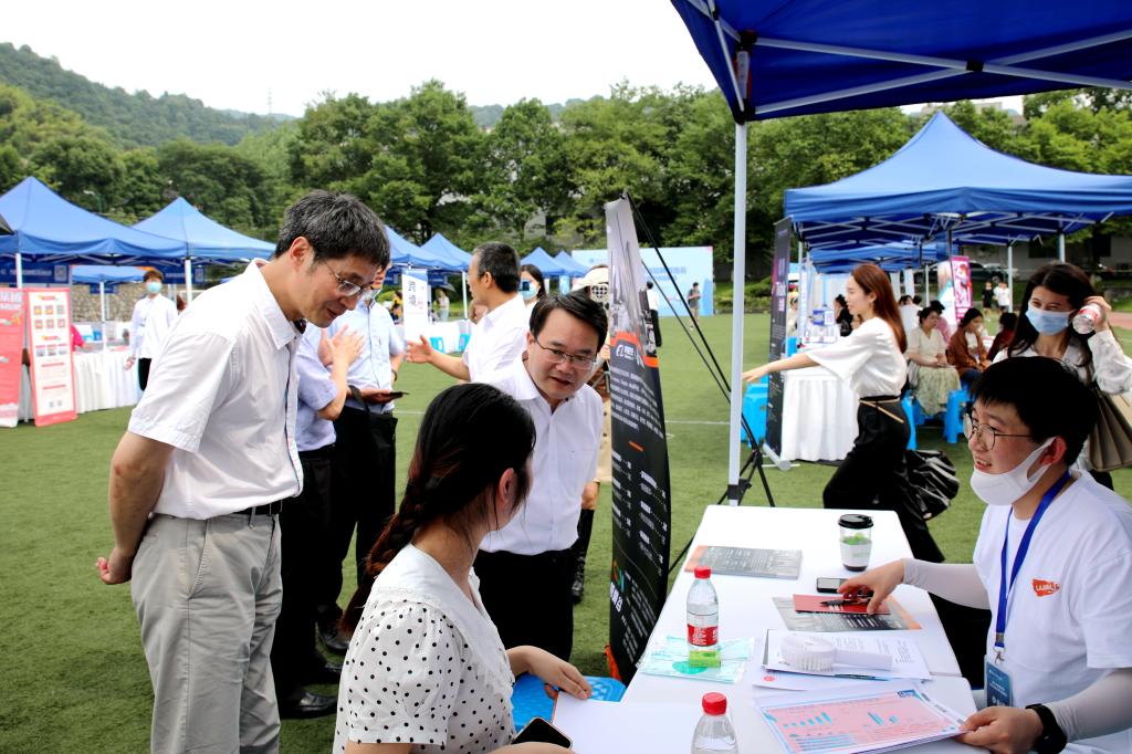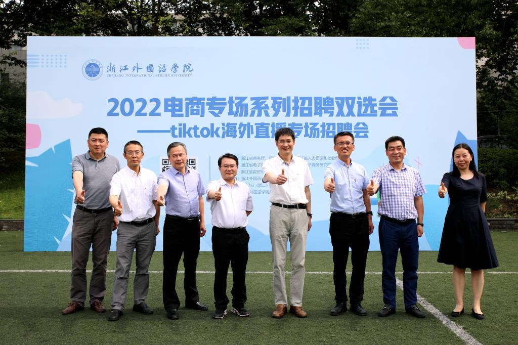 为推进就业市场供需精准对接,助力开云官网2022届毕业生高质量就业,6月7日,由省商务厅、教育厅、人力社保厅主办,开云官网协办的2022电商专场系列首场招聘双选会——tiktok海外直播专场招聘会在学校足球场举行。浙江省商务厅副厅长张钱江一行、校长洪岗、校党委副书记赵文波亲临现场关心指导学生应聘,与用人单位亲切交流。副校长张环宙出席交流座谈会。