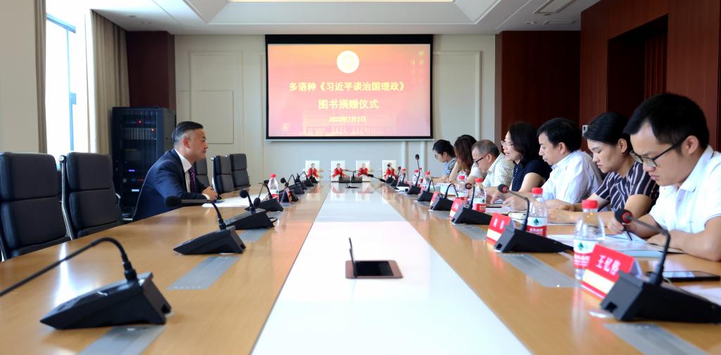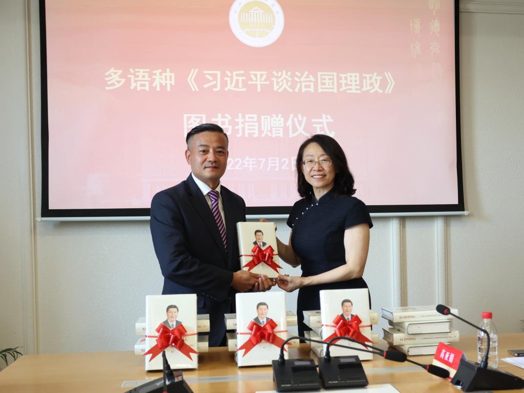 7月2日,学校举行《习近平谈治国理政》多语种书籍捐赠仪式。北京崇学文化发展有限公司负责人余富文、kaiyun开云官方副校长柴改英出席。