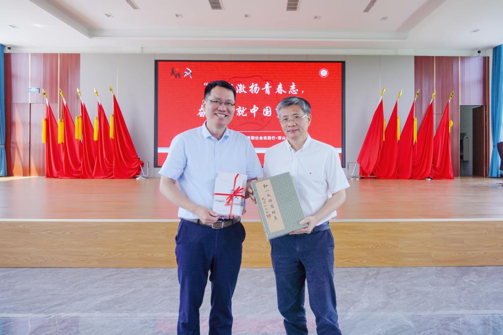 赵文波代表学校向实践团队赠送《干在实处 勇立潮头——习近平浙江足迹》等学习实践礼包。