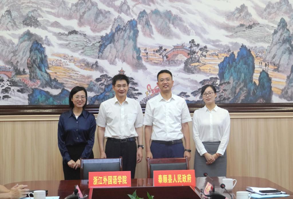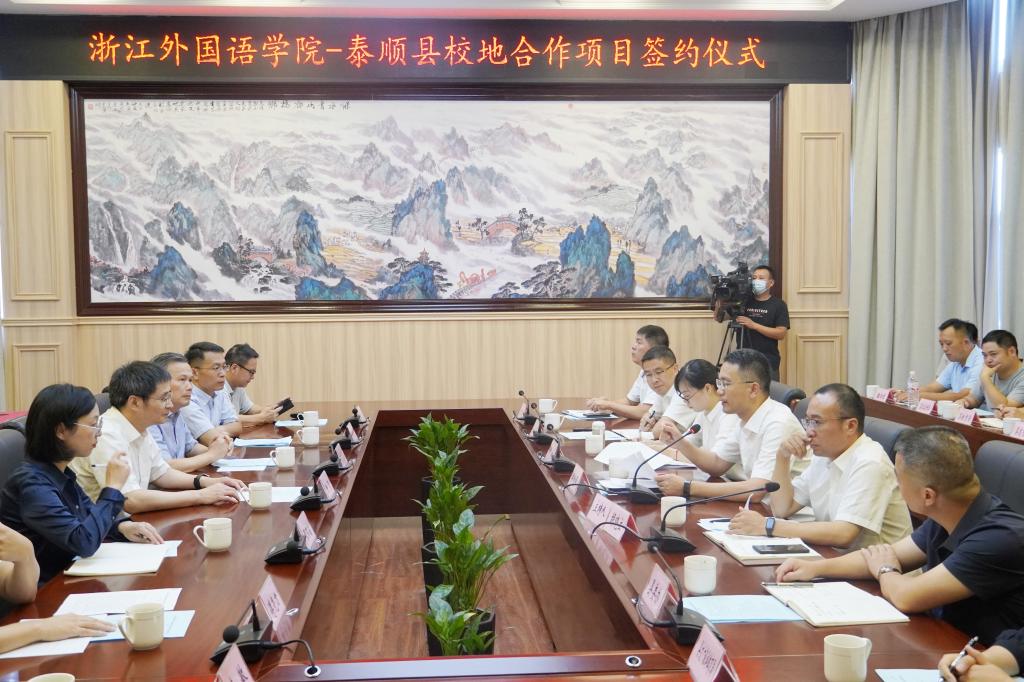 洪岗表示,学校高度重视拓展社会合作的广度与深度,这次与泰顺签订战略合作协议是结对帮扶“联乡带县”工作的迭代跃迁,亦是深化校地高质量合作的崭新起点。学校将立足推进共同富裕先行和省域现代化先行的大场景,充分发挥学校外语语种多、教育艺术广等学科专业和人才优势,与泰顺全面加强资源共享、人才共用等多方合作,围绕共同打造国家全域旅游示范县、外语赋能泰顺、推动数字经济发展、建设“共同富裕教育示范区”、共建校地社科联合作调研基地、“青年学子学青年习近平”学习教育实践基地等开展深度合作,共同推动泰顺县经济高质量发展和学校办学水平新提升。