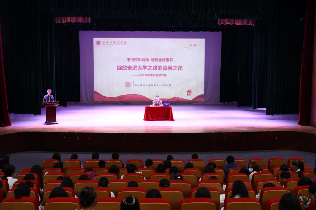 洪校长从“大学是什么样子、浙外是什么样的大学”出发,与新生们分享了大学与中学的区别,从校情、校史教育,开放包容、与时俱进、勇于自我革新的浙外气质等方面,带领新生回顾了学校特殊的发展历史。