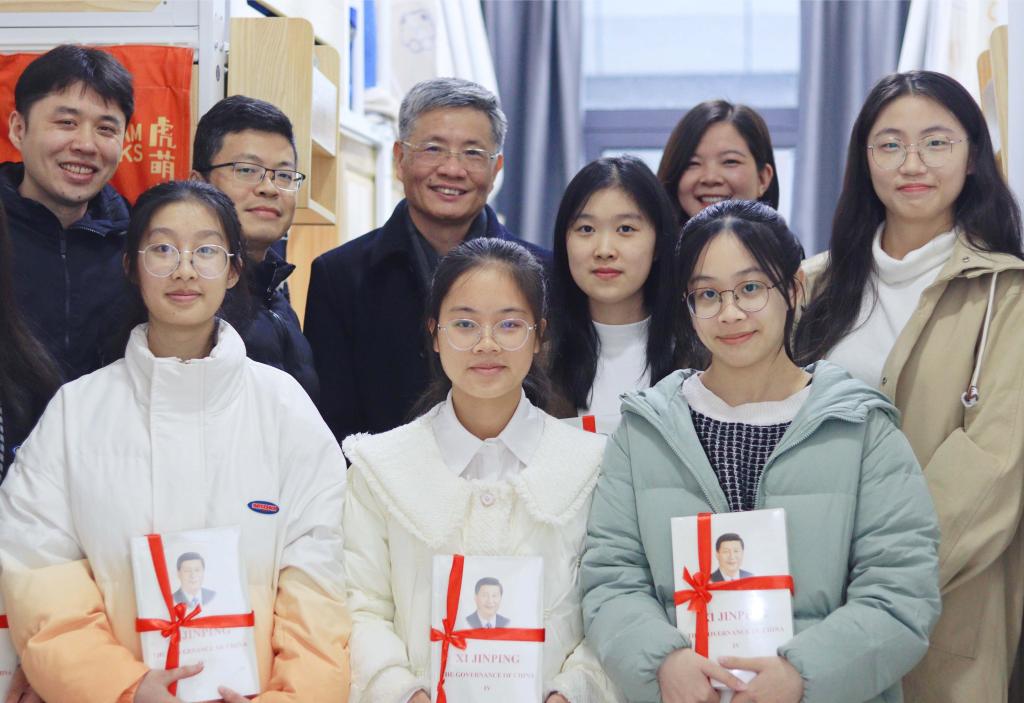 宣勇赠与每位同学一本英文版《习近平谈治国理政》(第四卷),希望同学们认真学习贯彻习近平新时代中国特色社会主义思想,做有理想信念、爱国为民、勤奋好学、吃苦耐劳的浙外青年。同学们接过承载宣书记沉甸甸希望的书籍,纷纷回应定会立志奋进,不负所托,努力为学校发展、社会进步、国家富强贡献自己的青春力量。